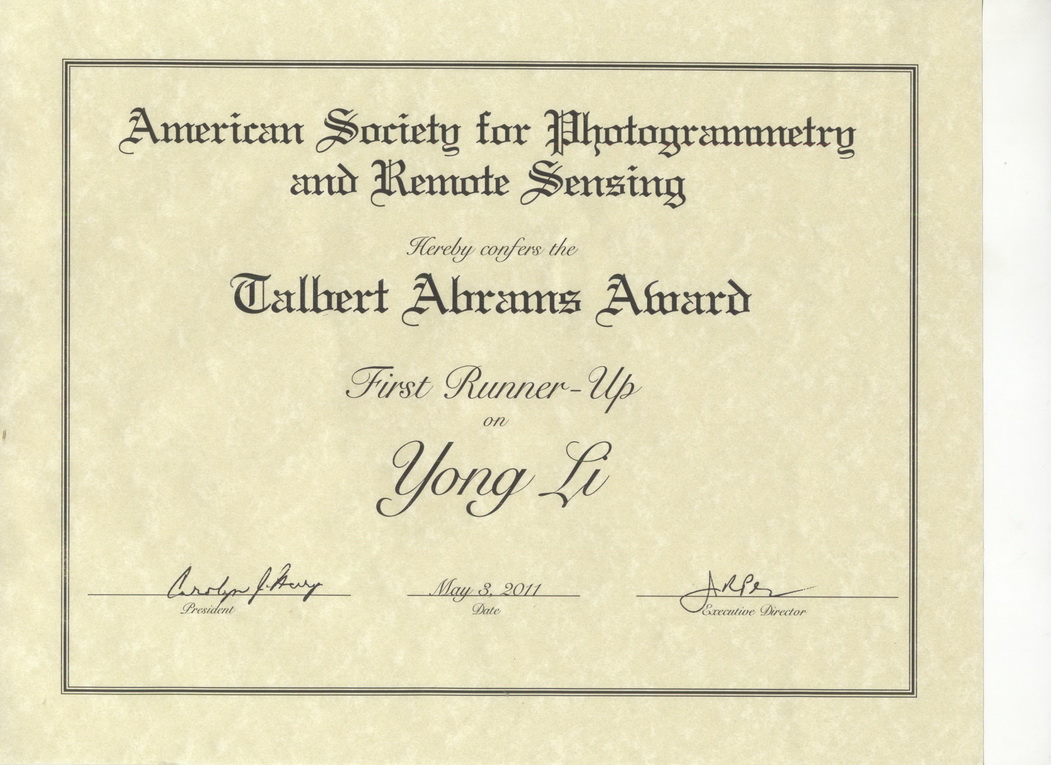 2、Talbert Abrams Award,美国摄影测量与遥感学会(ASPRS),吴华意; 李勇; 李军; 龚健雅,2011-05-03,国际学术奖,一等奖,