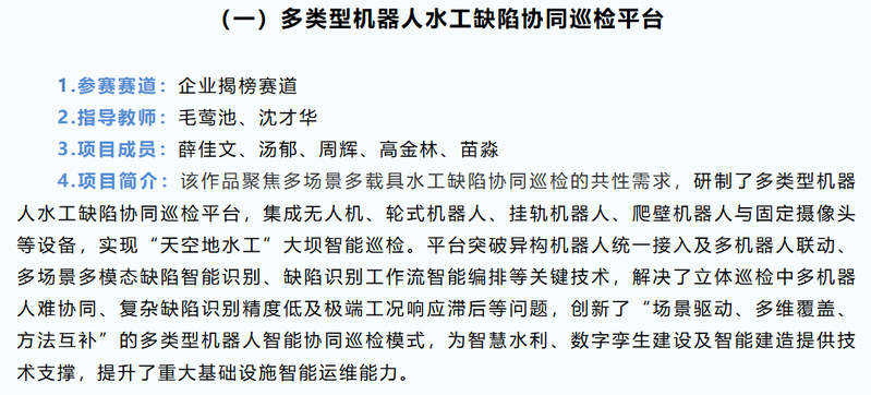 (二)在研科研项目 (1)“十四五”国家重点研发课题:高坝大库系统巡检与自然灾害损害监测及场景构建 (2)科技研发项目:基于多无人载具协同的工程缺陷巡检技术研发及应用服务 (3)省重点研发计划:安全生产事故隐患智慧诊断关键技术与应用示范 (4)省科技成果转化项目—揭榜挂帅项目:自主C86高性能处理器与服务器系统的研发及产业化 (5)省重点研发计划:基于数字孪生的水电工程安全运行智慧管控模式 (6)国家电网公司科技项目:基于气象数据增强的大规模海上风电爬坡事件预测预警关键技术研究 (7)生态环保项目:基于无人机群的水库水环境监测技术研发及应用服务 (8)科技研发项目:基于多系统联动感知的水工运维外部应急风险智能响应研究 (三)实验室条件 实验室为同学开展科研工作提供了良好的实验环境: (1) 配置了5台计算服务器,2*Nvidia A100 80G,2*Nvidia A800,4*Nvidia 3090 24G,以及远程独享使用8*海光DCU 32G,用于开展AI训练与推理任务。 (2)配置了若干Nvidia Jetson AGX Orin 64GB - Orin Nano 8GB系列开发板,用于边缘侧模型微调与推理工作。 (3)配置了科研开发的大疆行业级无人机、巡检机器狗等无人载具。 说明:实验室允许同学研二暑假实习,导师根据同学意愿推荐实习或者工作单位。 期待有志于科研的同学们加入实验室。