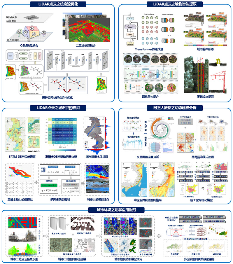 致力于发展以LiDAR信息智能感知为核心、时空大数据分析为驱动的城市空间治理新模式,重点开展目标智能识别、城市POI信息挖掘、船舶AIS大数据分析、地学应用服务等方面的研究,形成“数据耦合→要素感知→时空分析→综合治理”研究框架。