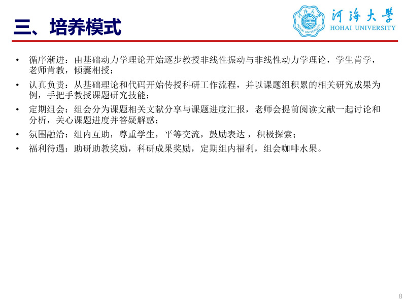 教学成果教学资源机械振动学 结构动力学 智能制造导论 自动控制原理 机械CAD/CAM技术 社会职务江苏省力学学会会员,中国工程机械学会会员,担任国际优秀期刊Thin-walled structures、Nonlinear Dynamics 、 Communication in Nonlinear Science and Numerical Simulation、Journal of sound and vibration、Chaos, Solitons and Fractals等期刊审稿人工作。 荣誉及奖励招生信息河海大学机电工程学院动力学与控制课题组目前拥有3名老师,均毕业于哈尔滨工业大学,与国内外著名高校与科研机构均有良好的合作关系,欢迎对仿生机器人,减振隔振理论,结构动力学与振动控制等方向感兴趣的同学加入团队,欢迎本科生从事上述方向的本科毕业设计。 |