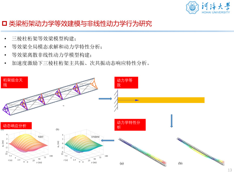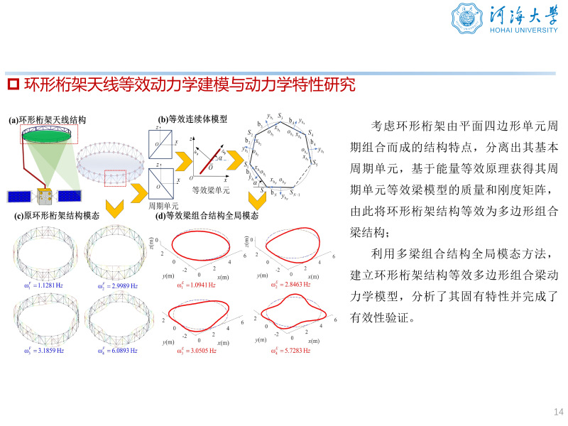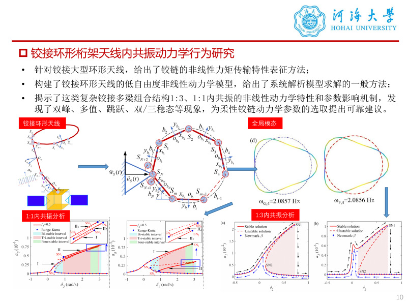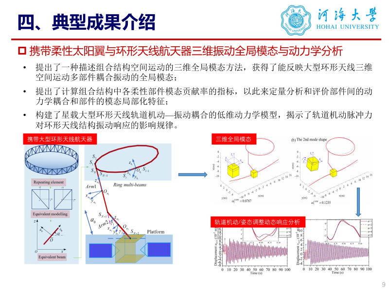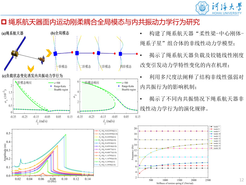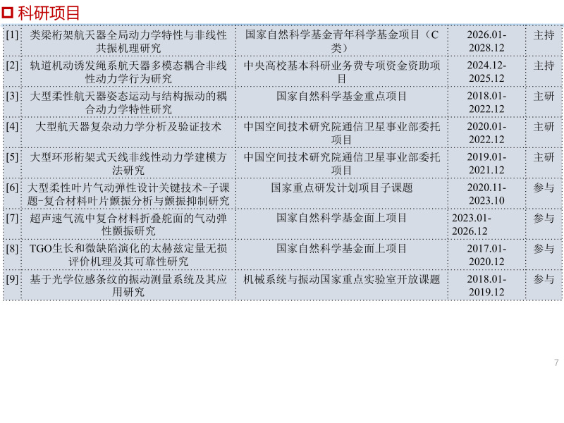 科研项目: [1] 国家自然科学基金青年科学基金项目(C类),2026.01-2028.12. 主持 [2] 中央高校基本科研业务费专项资金资助项目,2024.12-2025.12. 主持 [3] 常州市科技计划应用基础研究计划专项项目,2025.4-2027.4. 主持 [4] 国家自然科学基金重点项目“大型柔性航天器姿态运动与结构振动的耦合动力学特性研究”,2018.01-2022.12,项目编号:11732005. 参与 [5] 国家重点研发计划项目“大型柔性叶片气动弹性设计关键技术”子课题“复合材料叶片颤振分析与颤振抑制研究”,2020.11-2023.10,子课题编号:2020YFB1506702-03. 参与 [6] 国家自然科学基金面上项目“TGO生长和微缺陷演化的太赫兹定量无损评价机理及其可靠性研究”,2017.01-2020.12,项目编号:51675103. 参与 [7] 中国空间技术研究院通信卫星事业部委托项目“大型环形桁架式天线非线性动力学建模方法研究”,2019.01-2021.12,项目编号:D020213. 参与 [8] 中国空间技术研究院通信卫星事业部委托项目“大型航天器复杂动力学分析及验证技术”,2020.01-2022.12,项目编号:D020201. 参与