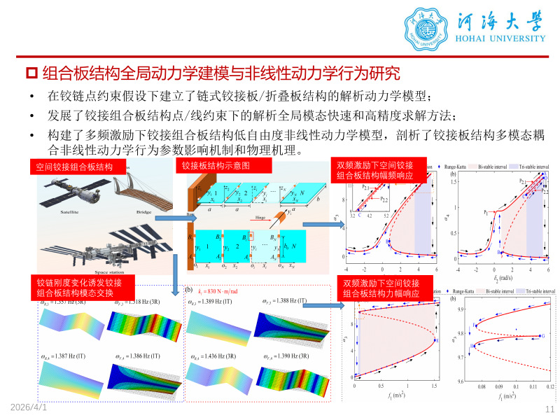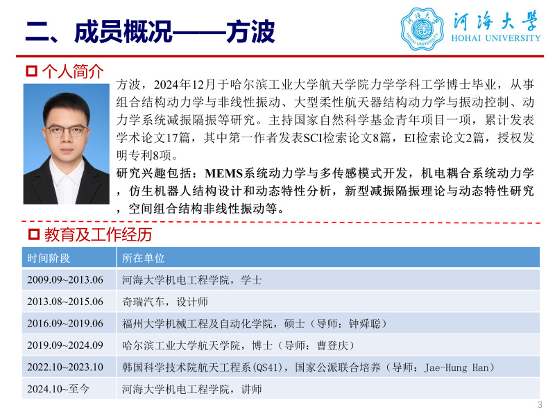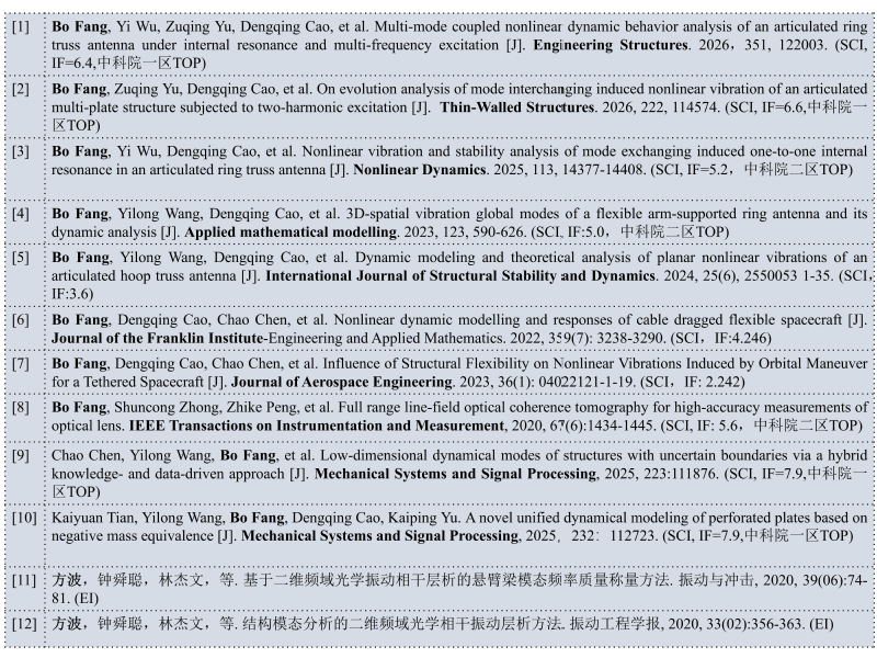 个人简介方波,河海大学机电工程学院讲师,博士毕业于哈尔滨工业大学力学学科,师从曹登庆教授,从事组合结构动力与非线性振动、大型柔性航天器结构动力学与振动控制、动力学系统减振隔振、MEMS系统动力学与多传感模式开发等研究,研究兴趣包括:MEMS系统非线性动力学与多传感模式研究,仿生机器人结构设计和动态特性分析,新型减振隔振理论与动态特性研究,结构动力学与振动控制,空间组合结构非线性振动等。在IEEE Transactions on Instrumentation and Measurement、 Engineering Structures、Nonlinear Dynamics、Thin-walled Structures、Applied Mathematical Modelling、Journal of the Franklin Institute、International Journal of Structural Stability and Dynamics、Mechanical Systems and Signal Processing等国际优秀期刊累计发表学术论文18篇,其中第一作者10篇,SCI检索8篇,EI检索2篇,授权国家发明专利9项。担任国际优秀期刊Thin-walled structures、Nonlinear dynamics、Journal of sound and vibration等期刊审稿人工作。主持国家自然科学基金青年科学基金项目(C类)、中央高校基本科研业务费专项资金资助项目和常州市应用基础研究计划专项项目3项,以项目骨干身份参与国家自然科学基金面上项目和重点项目3项。欢迎对仿生机器人,减振隔振理论,结构动力学与振动控制等方向感兴趣的同学加入团队,欢迎本科生从事上述方向的本科毕业设计。 联系方式:fangbofty@hhu.edu.cn 办公室:58号楼402室 教育经历: 2022.10—2023.10 韩国科学技术院, 航天工程系, 博士研究生联合培养(合作导师:Jaehung Han教授) 2019.09—2024.12 哈尔滨工业大学, 力学专业, 博士(导师:曹登庆教授) 2016.09—2019.06 福州大学,测试计量技术及仪器专业, 硕士(导师:钟舜聪研究员) 2009.09—2013.06 河海大学,机械工程及自动化专业, 本科 发表论文: [1] Bo Fang, Shuncong Zhong*, Qiukun Zhang, Jianfeng Zhong, Qiben Lin, Yingjie Yu, Zhike Peng. Full range line-field optical coherence tomography for high-accuracy measurements of optical lens. IEEE Transactions on Instrumentation and Measurement, 2020, 67(6):1434-1445. (SCI收录 TOP, IF: 5.6) [2] Bo Fang, Dengqing Cao*, Chao Chen, Yishen Tian, Youxia Li. Influence of Structural Flexibility on Nonlinear Vibrations Induced by Orbital Maneuver for a Tethered Spacecraft [J]. Journal of Aerospace Engineering. 2023, 36(1): 04022121-1-19.(SCI收录,IF: 2.242) [3] Bo Fang, Dengqing Cao*, Chao Chen, Shuai Chen. Nonlinear dynamic modelling and responses of cable dragged flexible spacecraft [J]. Journal of the Franklin Institute-Engineering and Applied Mathematics. 2022, 359(7): 3238-3290.(SCI收录,IF:4.246) [4] Bo Fang, Yilong Wang*, Yi Wu, Jae-Huang Han, Dengqing Cao. Dynamic modeling and theoretical analysis of planar nonlinear vibrations of an articulated hoop truss antenna [J]. International Journal of Structural Stability and Dynamics. 2024, 25(6), 2550053 1-35.(SCI收录,IF:3.6) [5] Bo Fang, Yilong Wang*, Bingheng Zhu, Yi Wu, Yishen Tian,Youxia Li, Dengqing Cao. 3D-spatial vibration global modes of a flexible arm-supported ring antenna and its dynamic analysis [J]. Applied mathematical modelling. 2023, 123, 590-626.(SCI收录 TOP,IF:5.0) [6] Bo Fang, Yi Wu, Yi Chen, Jipeng Li, Rongzhou Lin, Chao Chen, Dengqing Cao*. Nonlinear vibration and stability analysis of mode exchanging induced one-to-one internal resonance in an articulated ring truss antenna [J]. Nonlinear Dynamics. 2025,113, 14377-14408.(SCI收录 TOP, IF=5.2) [7] Bo Fang*, Yi Wu, Zuqing Yu, Qianlong Tian, Dengqing Cao. Multi-mode coupled nonlinear dynamic behavior analysis of an articulated ring truss antenna under internal resonance and multi-frequency excitation [J]. Engineering Structures. 2026,351, 122003.(SCI收录 TOP, IF=6.4) [8] Bo Fang*, Shuai Chen, Zuqing Yu, Qianlong Tian, Dengqing Cao. On evolution analysis of mode interchanging induced nonlinear vibration of an articulated multi-plate structure subjected to two-harmonic excitation [J]. Thin-Walled Structures. 2026, 222, 114574. (SCI收录 TOP, IF=6.6) [9] Yishen Tian, Xiaoyun Zhang, Chao Chen, Bo Fang, Dengqing Cao*. Vibration isolation performance of a beam clamped with torsional quasi-zero stiffness isolator [J]. Journal of Vibration and Control. 2024, 30(9-10):1947-1957.(SCI收录,IF=2.633) [10] Shuai Chen, Dengqing Cao*, Jin Wei, Guiqin He, Bo Fang, Youxia Li. Investigations on nonlinear dynamic modeling and vibration responses of T-shaped beam structures [J]. Actuators, 2022, 11(10): 293.(SCI收录, IF=2.523) [11] Chao Chen, Yilong Wang*, Bo Fang, Shuai Chen, Yang Yang, Biao Wang, Hesheng Han, Dengqing Cao. Low-dimensional dynamical modes of structures with uncertain boundaries via a hybrid knowledge- and data-driven approach [J]. Mechanical Systems and Signal Processing, 2025, 223:111876. (SCI收录 TOP, IF=7.9) [12] Chao Chen, Yilong Wang*, Shuai Chen, Bo Fang, Dengqing Cao. Knowledge and data fusion-driven dynamical modeling approach for structures with hysteresis-affected uncertain boundaries [J]. Nonlinear Dynamics, 2025,113:4179-4195. (SCI收录 TOP, IF=5.2) [13] Xiaodong Zhang, Yilong Wang*, Jipeng Li, Shuai Chen, Bo Fang, Jinpeng Wang, Dengqing Cao. Parametric global mode method for dynamical modeling and response analysis of a rotating and length-varying flexible manipulator [J]. Mechanical Systems and Signal Processing, 2025, 224: 112077.(SCI收录 TOP, IF=7.9) [14] Kaiyuan Tian, Yilong Wang*, Bo Fang, Dengqing Cao, Kaiping Yu. A novel unified dynamical modeling of perforated plates based on negative mass equivalence [J]. Mechanical Systems and Signal Processing, 2025,232:112723. (SCI收录 TOP, IF=7.9) [15] Yi Wu, Muxuan Guo, Vladislav Sorokin, Lihua Tang*, Bo Fang, Kean C. Aw, Hesheng Han.Multi-Directional Nonlinear Energy Sink with Quasi-Zero Stiffness Property Inspired by Origami [J].Thin