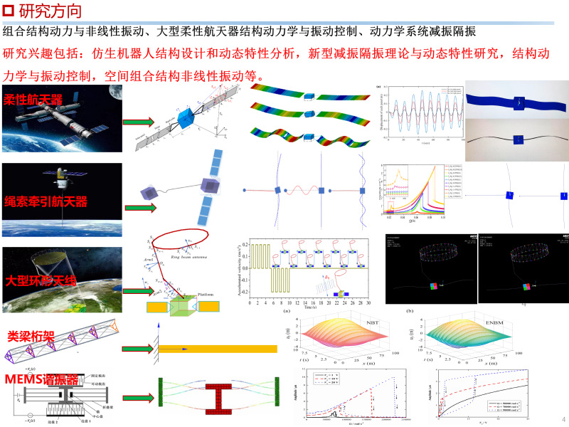 研究领域研究兴趣包括:MEMS系统动力学与多传感模式开发,机电耦合系统动力学,仿生机器人结构设计和动态特性分析,新型减振隔振理论与动态特性研究,空间组合结构非线性振动等。